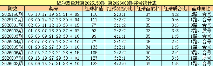 福彩双色球第2026008期红球奖号为:06、09、16、27、31、33,蓝球奖号为:10,其中红球和值为122,012路比为4:2:0,首尾和为39,质合比为1:5,蓝球属性为1路、合号。